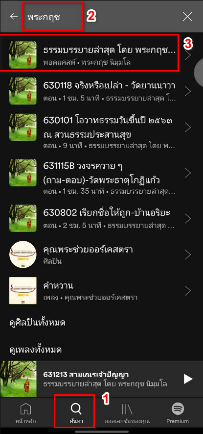 - หลังจากติดตั้งเรียบร้อย ให้เปิด App คลิกที่แถบ ค้นหา ที่ด้านล่าง และพิมพ์ “พระกฤช” ในช่องการค้นหาด้านบน และคลิกเลือกที่รายการ “ธรรมบรรยายล่าสุด โดย พระกฤช นิมฺมโล”